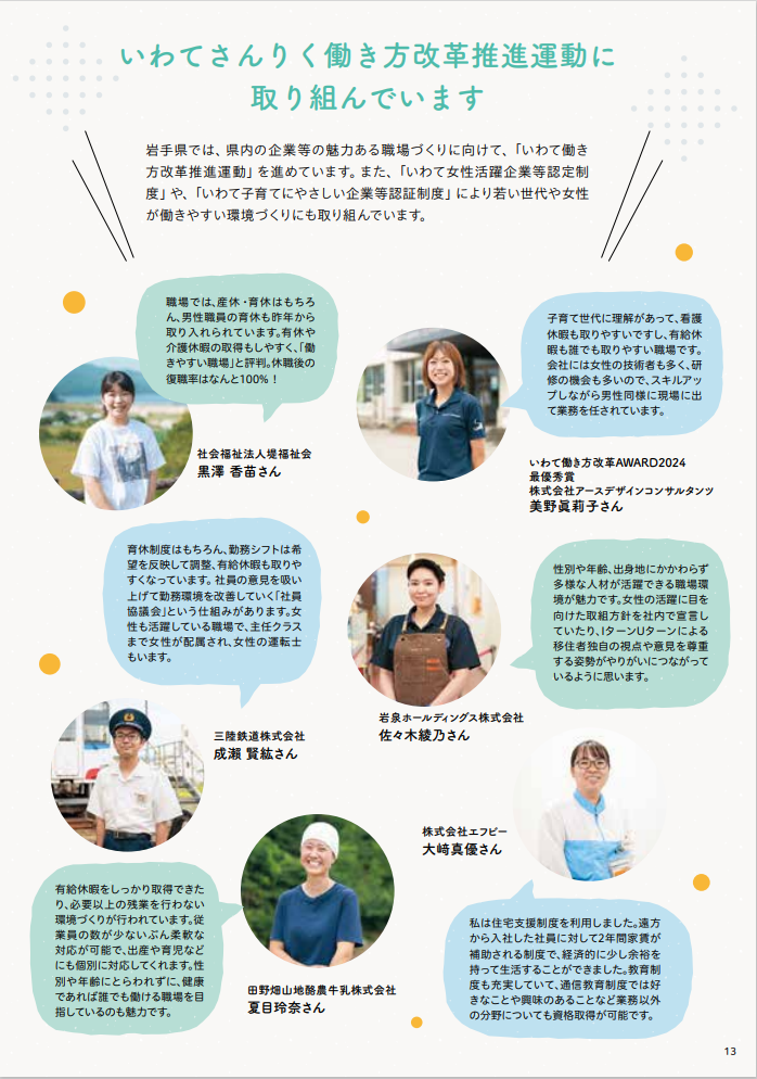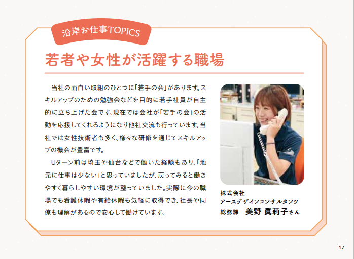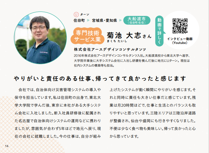 2025年12月15日 / 最終更新日時 : 2025年12月15日 k-giken おしらせ 「いわてさんりくお仕事ガイド」に掲載されました! 岩手県沿岸広域振興局様発行の「いわてさんりくお仕事ガイド」に当社社員のインタビューが掲載されました! 「いわてさんりくお仕事ガイド」は岩手県での就職を支援するための情報提供を目的に作成され、U・Iターン就職者のインタビューを通じて、三陸地域で働くことや地域の魅力などを発信している情報誌です。 当社からは2名の社員のインタビューが掲載されていますので、是非ご覧ください。 ★デジタルブック版はこちらから ☆インタビュー動画はこちらから