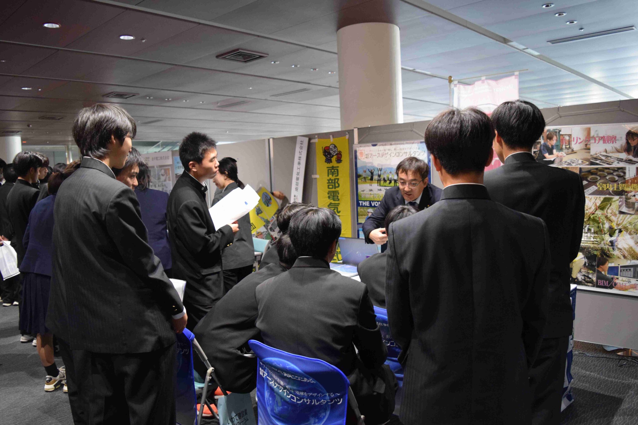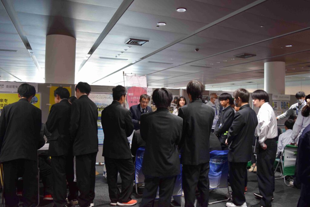 2時間半という短い時間ではありましたが、当社のブースにもたくさんの学生の皆様にお越しいただき、企業の説明や仕事内容、福利厚生などについてお話しをさせていただきました。特に当社の特徴である 「会社行事の多さ」 に興味を持つ声が多く、様々な質問や会話を通じて交流を深めることができました。また将来を考える高校生ならではの“お給料はどのくらいですか?”“休みはどれくらい取れますか?”といった素直な質問も飛び交い、終始和気あいあいとした雰囲気に包まれたブース内でした。