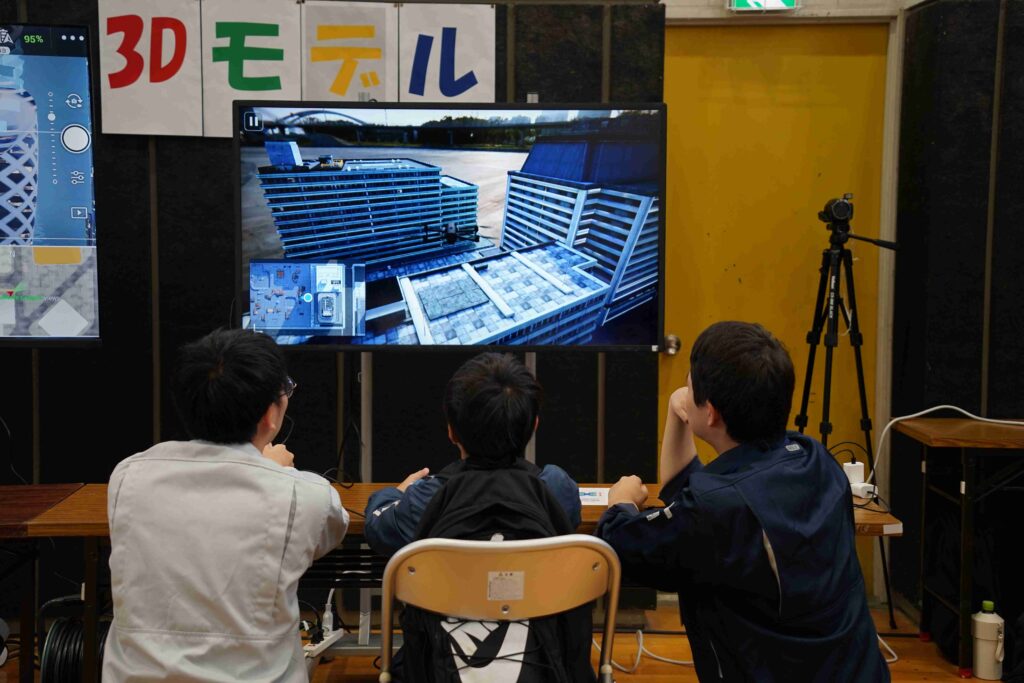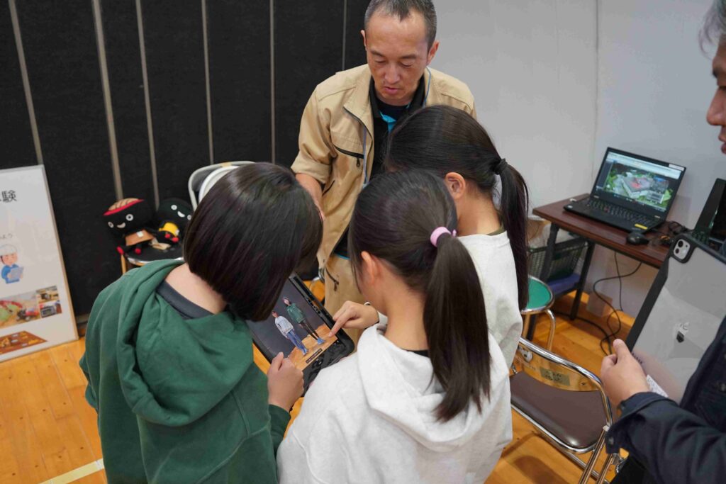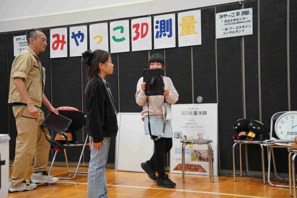 3D測量では、測量の方法やコツを説明した後、ぬいぐるみや自分たちの姿をお互いに測量してみる体験を実施。測量される側の子どもは、ちょっぴり恥ずかしそうにしながらも、画面に映し出される3D点群の画像データを見て「すごい!」と驚いていました。楽しそうに笑い合いながら、測量の仕組みを体感している姿が印象的で、技術の面白さを感じてもらえたようです。
