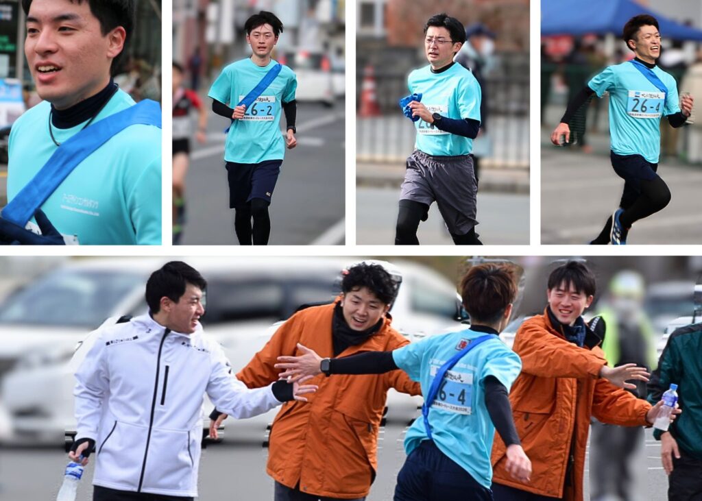 大会当日は悪天候が心配されましたが、天候が崩れることはなく、沿道から多くの温かな声援が送られました。また、当社からも社長をはじめ多数の社員が応援やサポートのために駆けつけ、出場メンバーは地域への感謝の想いを胸に全力を尽くしました。