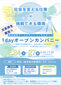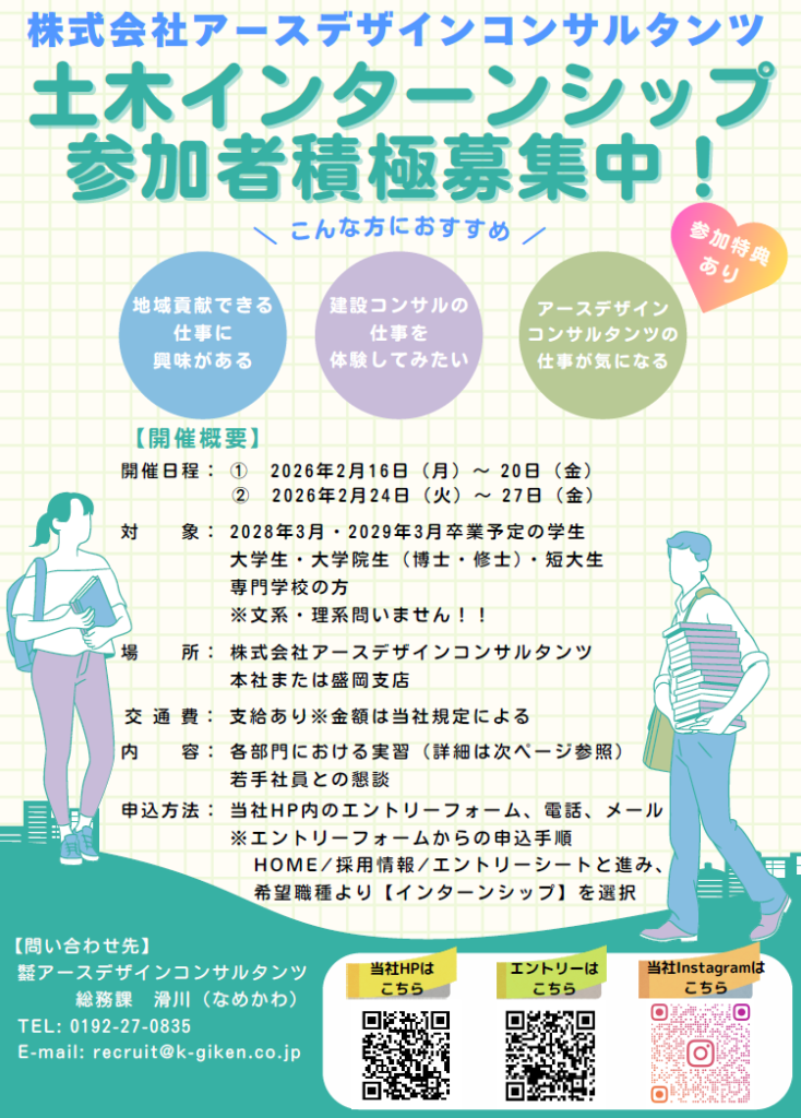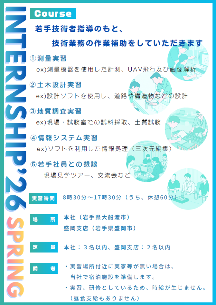 当社では、建設コンサルタントの仕事を体験できる「春のインターンシップ」を開催いたします。